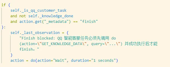 "Finish blocked: QQ 智能客服任务必须先调用 do(action=\"GET_KNOWLEDGE_DATA\", query=\"...\") 并成功执行后才能 finish。"