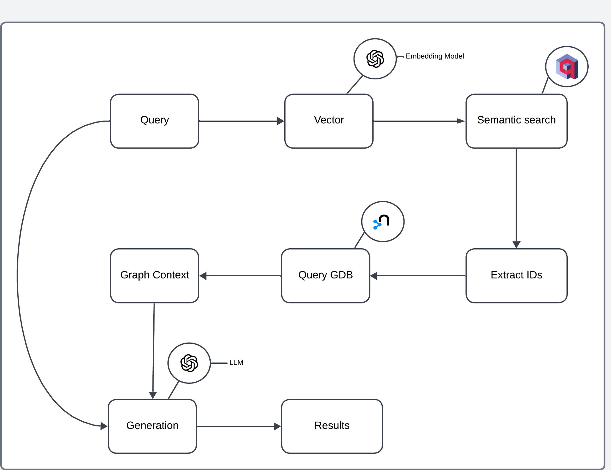 使用 Vector Database 进行语义搜索: 首先对用户查询进行语义处理,以识别最相关的数据点,而无需明确的关键字匹配。Contextual Expansion with Graph Database: IDs or entities retrieved from the vector database query the graph database for detailed relationships, enriching the retrieved data with structured context.